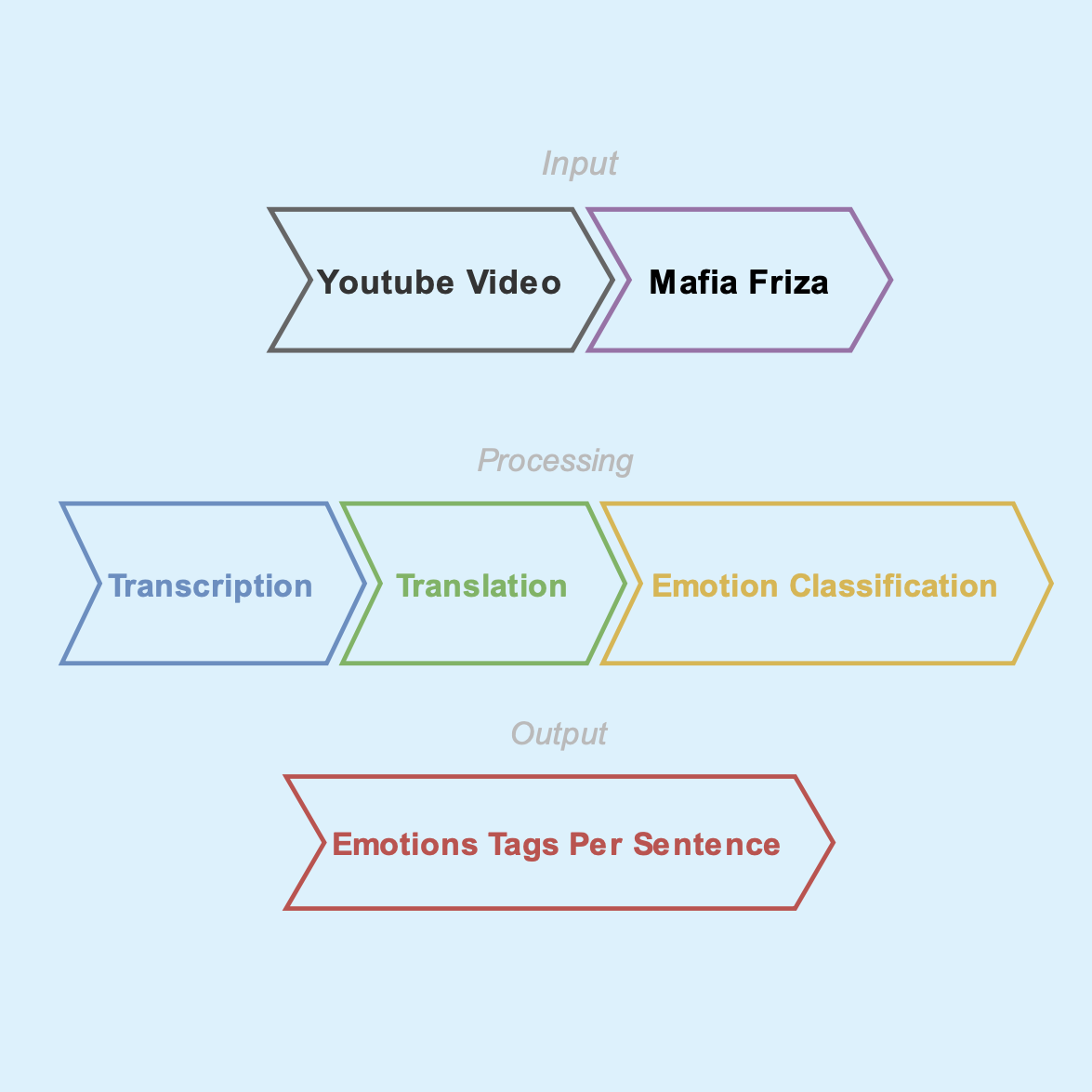 Pipeline providing emotion classification based on dialogues in videos, incorporating NLP and LLMs